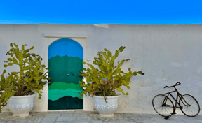 A blue door that stands out in the middle of the white city: a magnificent viewpoint awaits you.