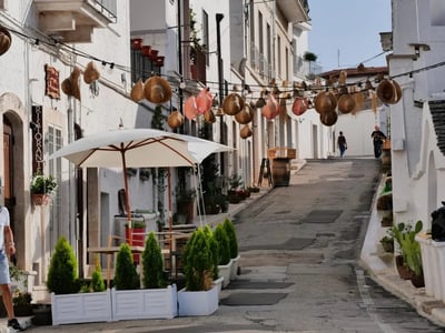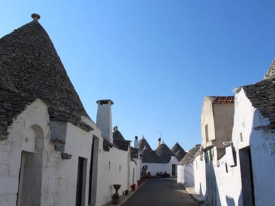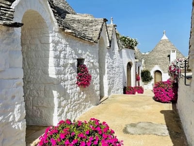 Un charmant village italien célèbre pour ses trulli, des maisons blanchies à la chaux avec des toits coniques.